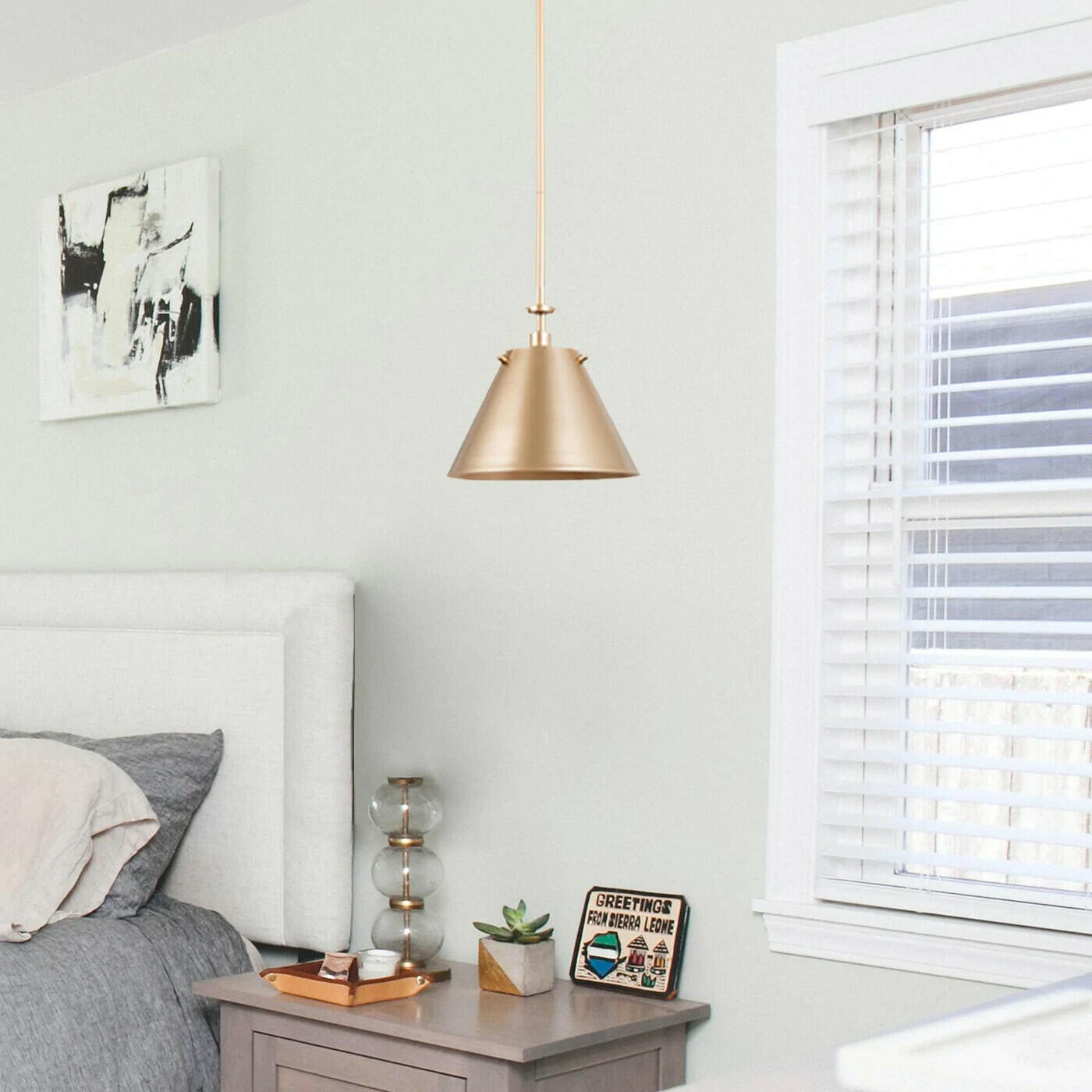 This beautiful transitional pendant features a sleek trumpet-shaped shade finished in sanded vintage gold. With the apparent retro-industrial vibes, this fixture is the perfect combination of the exquisite finish, soft and sophisticated shape, and meticulously-crafted details. Perfect for over your kitchen island area, living room, foyer, or powder room.