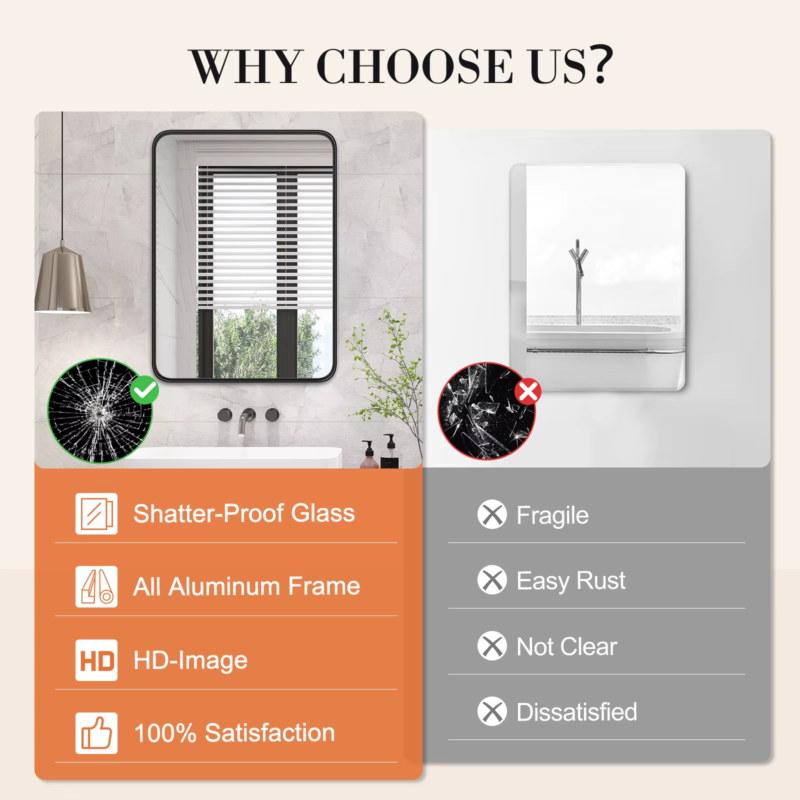 Clear Reflection & No Distortion: This wall-mounted bathroom mirror is crafted with high-definition float glass to ensure 1:1 image restoration, providing a crystal-clear reflection with no distortion. It is the perfect addition to your bathroom, especially for use over the sink.