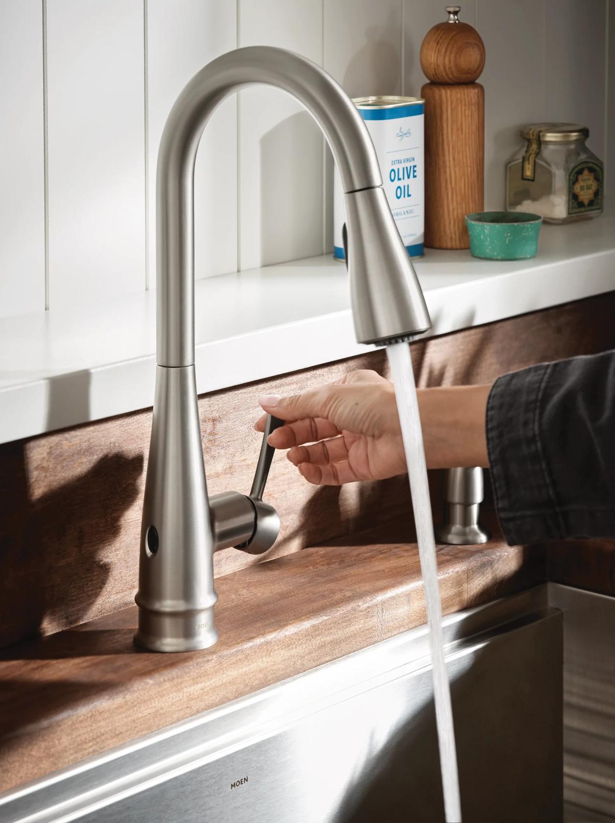 Faucets equipped with MotionSense wave technology are perfect for when your hands are too messy or too full to turn on the faucet. Featuring a single sensor on the faucet base that provides touchless control, MOEN's MotionSense wave allows users to turn water on and off with just the wave of a hand. The technology also helps prevent the spread of dirt and germs, since there's no need to touch the faucet handle to start water flow. The faucet can be controlled in 2-ways-the wave sensors on the left side of the faucet base, and the handle on the opposite side of the faucet offers manual operation. MOEN's MotionSense wave technology is intuitively simple and was designed to improve the experience at the kitchen sink by allowing you to complete tasks with efficiency.