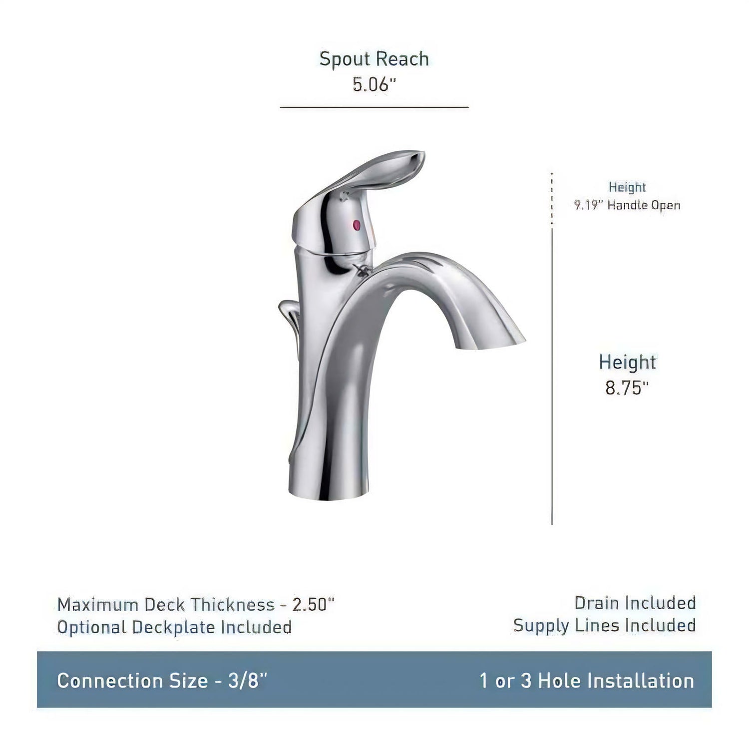 With flowing curves and a luxurious high-arc design, the MOEN Eva Single Hole Single Handle High-Arc Bathroom Faucet offers the perfect hybrid of style and functionality. Boasting understated elegance, it features petal like handles and a swan-like spout to bring a relaxed, upscale feeling to your bathroom. A beautiful chrome finish accents the overall look and offers a highly-reflective shine to complement your decor.