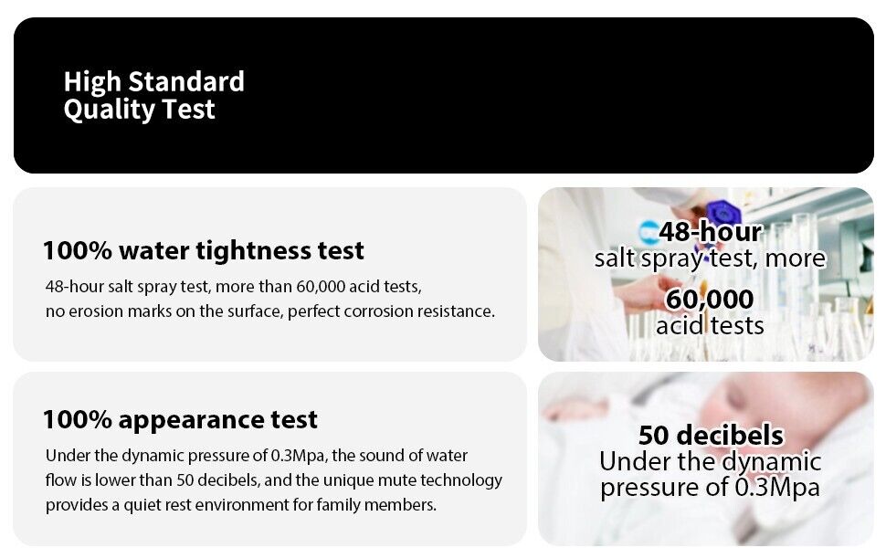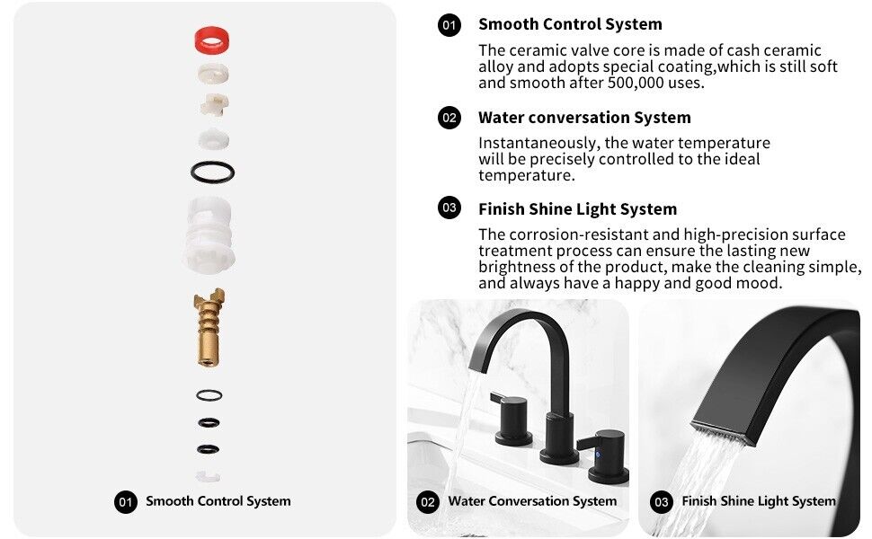 Smooth control system, The high-quality high-hardness wear-resistant ceramic valve core is made of cash ceramic alloy in a tight and closed environment, and adopts special coating, which is still soft and smooth after 500,000 uses, bringing you perfect control experience. Comfortable sense system, The smooth inner wall of faucet is equipped with constant-current water-saving bubbler, which makes the water flow soft and comfortable and rich in foam. Water self-clean system, Our faucet adopts German NEOPERL bubbler, which can remove the scale with a touch, keep the water flowing smoothly, and stop worrying about life. Water conversation system, Instantaneously, the water temperature will be precisely controlled to the ideal temperature, and the dynamic pressure constant current bubbler can ensure the constant flow of low pressure, medium pressure and high pressure, thus reducing the water waste caused by debugging and ensuring your constant and comfortable water use experience.