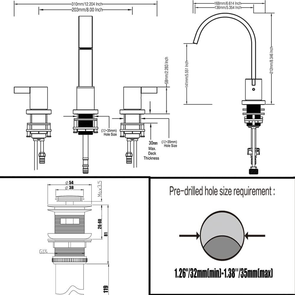 - Pre-drilled hole size: 1.1''-1.38'' (28mm-35mm). Max countertop thickness: 1.38'' (35mm).