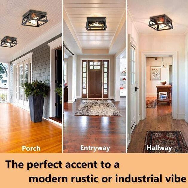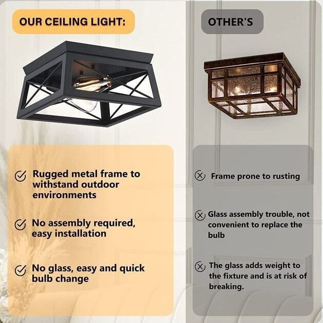 Durability The flush mount ceiling light fixture is made of a high-quality matte black metal frame, no need to worry about fading, rust, or corrosion, perfect for the porch, patio, balcony, outdoor hallway, balcony, deck, etc., Glass-free Design You don't need to struggle to remove the glass to change the bulb. The bottom is enlarged to accommodate the size of the bulb, and it is more convenient to clean and change the bulb. Open metal light fixtures are perfect for accenting your modern country or industrial retro style home and are a functional and aesthetic choice for bars, cafes, or restaurants., Compatible with All Types of Bulbs Standard E26 base, compatible with LED, incandescent, CFL, and halogen bulbs. You can also choose dimmable bulbs and switches to adjust the lights. It would be a good choice for hallways, stairwells, attics, pantries, and other places that need a light supplement., Easy to Install With installation instructions and required parts, the steps are simple. Due to the need to connect wires, if you have no installation experience, it is recommended to ask a professional to install it., 2-Year Pia Ricco lamps meet ETL standards and provide a 2-year . If you have any questions, please to us, providing 100% satisfied customer service is also part of our brand philosophy.