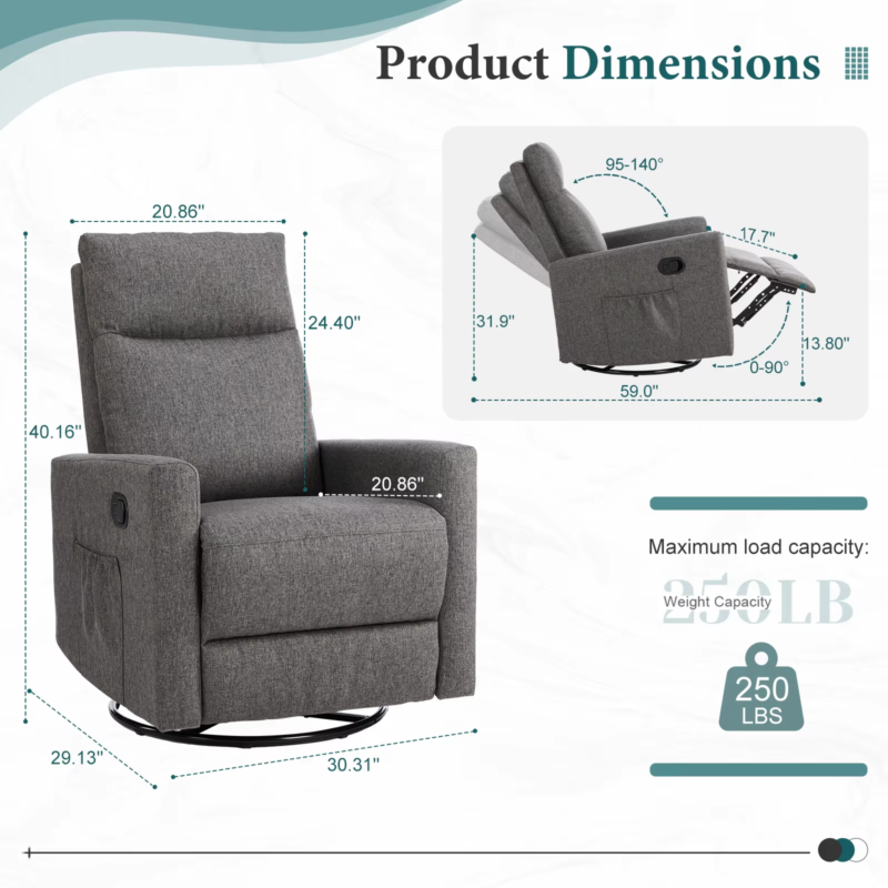 • 360° Revolving Recliner: This nursery rocking chair allows full 360° rotation. The backrest reclines from 95° to 160°, while the adjustable footrest extends from 0° to 90°, providing customizable comfort for various relaxation needs.