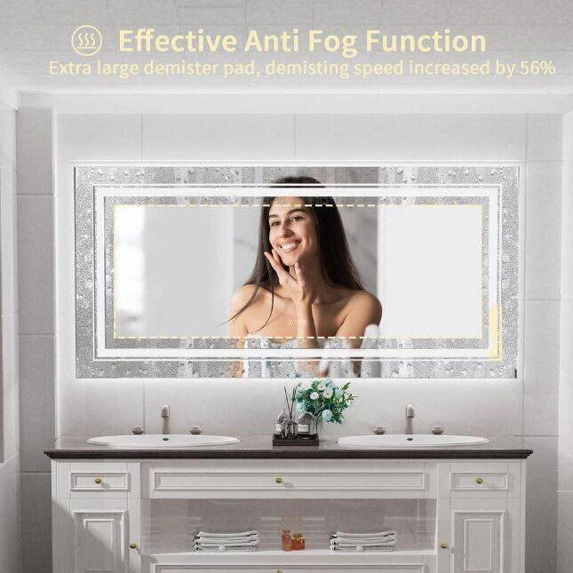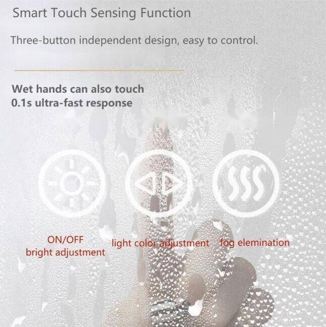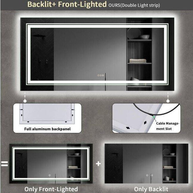 - Front light provides sufficient illumination, backlight can enhance the warm and romantic atmosphere. The frosted and frameless design endows smart mirror with elegance. Not only a bath mirror, but also a vanity mirror or wall-mounted decor.