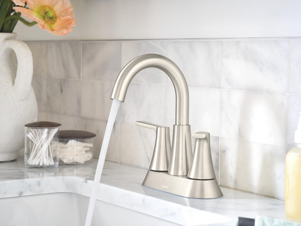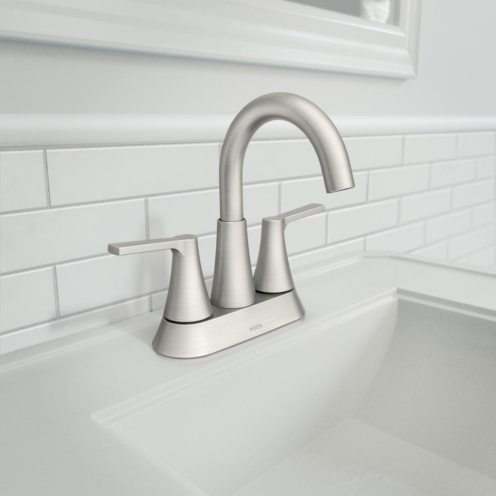 Made up of smooth, fluid curves, the Mikah™ collection offers a soft modern style that can add a touch of warmth to the bathroom. The centerset design allows for easy installation, while creating a beautiful and timeless aesthetic. Available in Moen's exclusive Spot Resist™ Brushed Nickel, which resists fingerprints and water spots for easy cleaning.