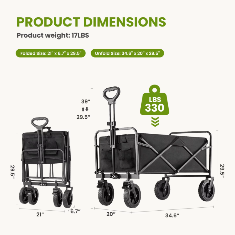 • Large Capacity Collapsible Wagon Cart: With dimensions of 29.5'' x 18.5'' x 35'', Our Folding Wagons Carts have plenty of room to store all your essentials for your outdoor adventures. It can effortlessly carry up to 220lbs of gear, making it ideal for hauling camping equipment, gardening supplies, groceries, and more.